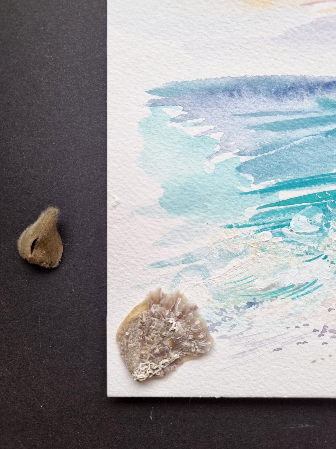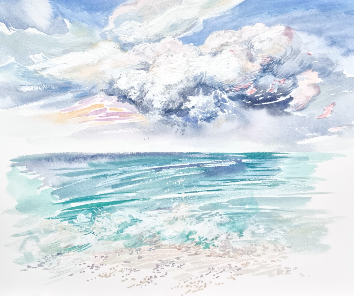 This watercolor was created on a quiet morning by the Mediterranean Sea in Turkey. The light was soft and ever-changing — the horizon shimmered with delicate turquoise and jade tones, while the clouds above shifted from silvery white to shades of lilac and rose. I was fascinated by the contrast between the calm sea and the restless sky, where every brush of wind seemed to alter the colors before my eyes. As I painted, I tried to capture not only the scene itself but also the subtle harmony between air, water, and light.