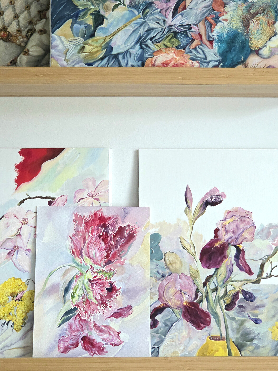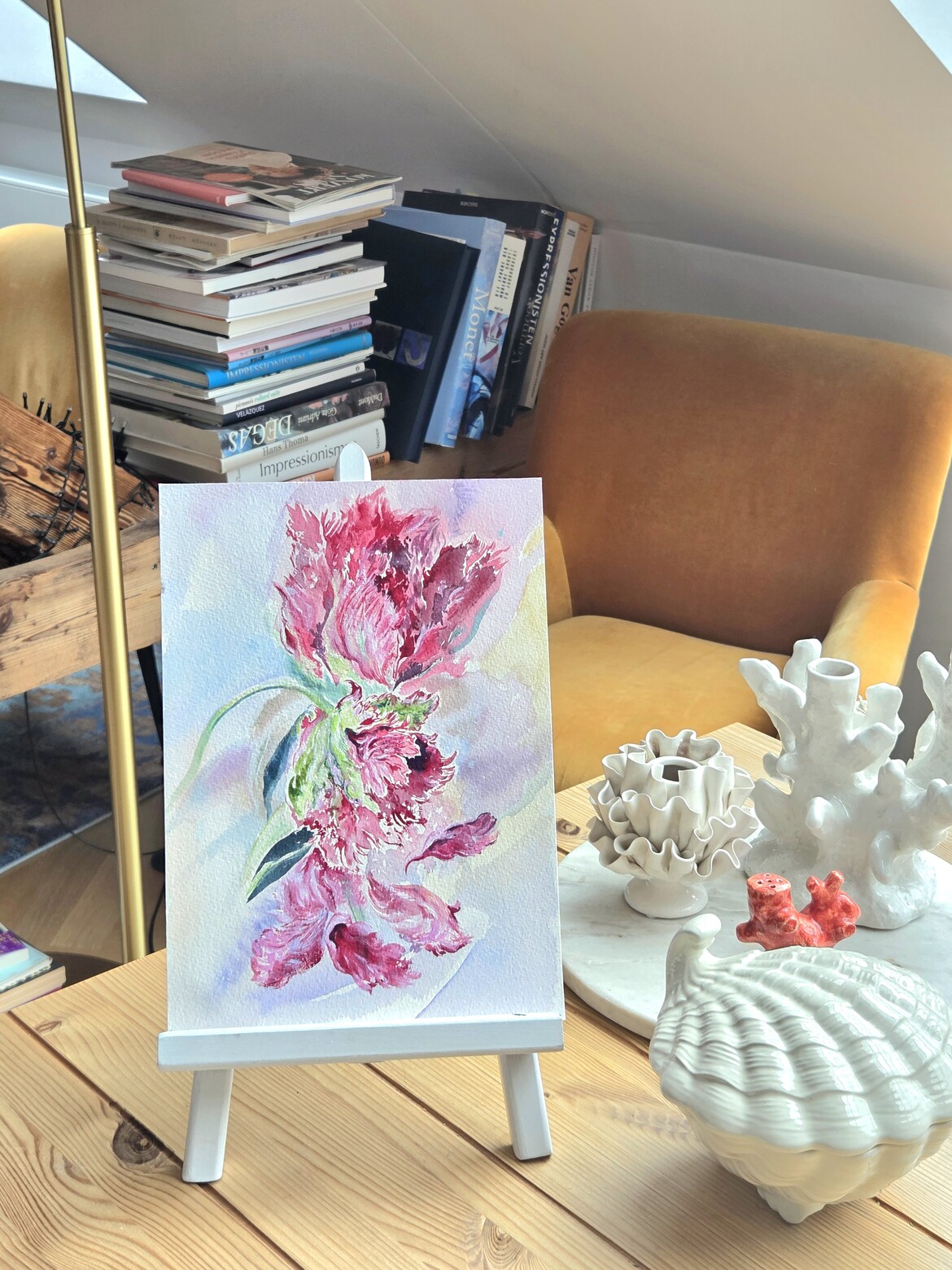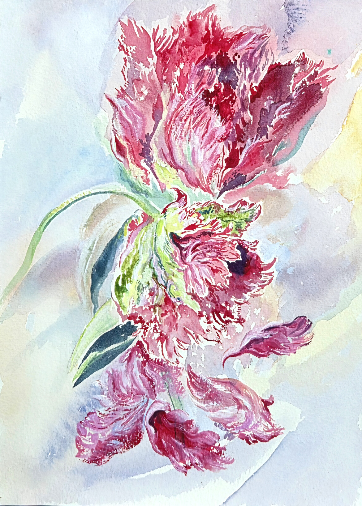 In this watercolor, I capture tulips at the peak of their bloom — open, expressive, and slightly untamed. I was drawn to the moment when beauty feels alive and almost restless, when softness carries a quiet intensity.