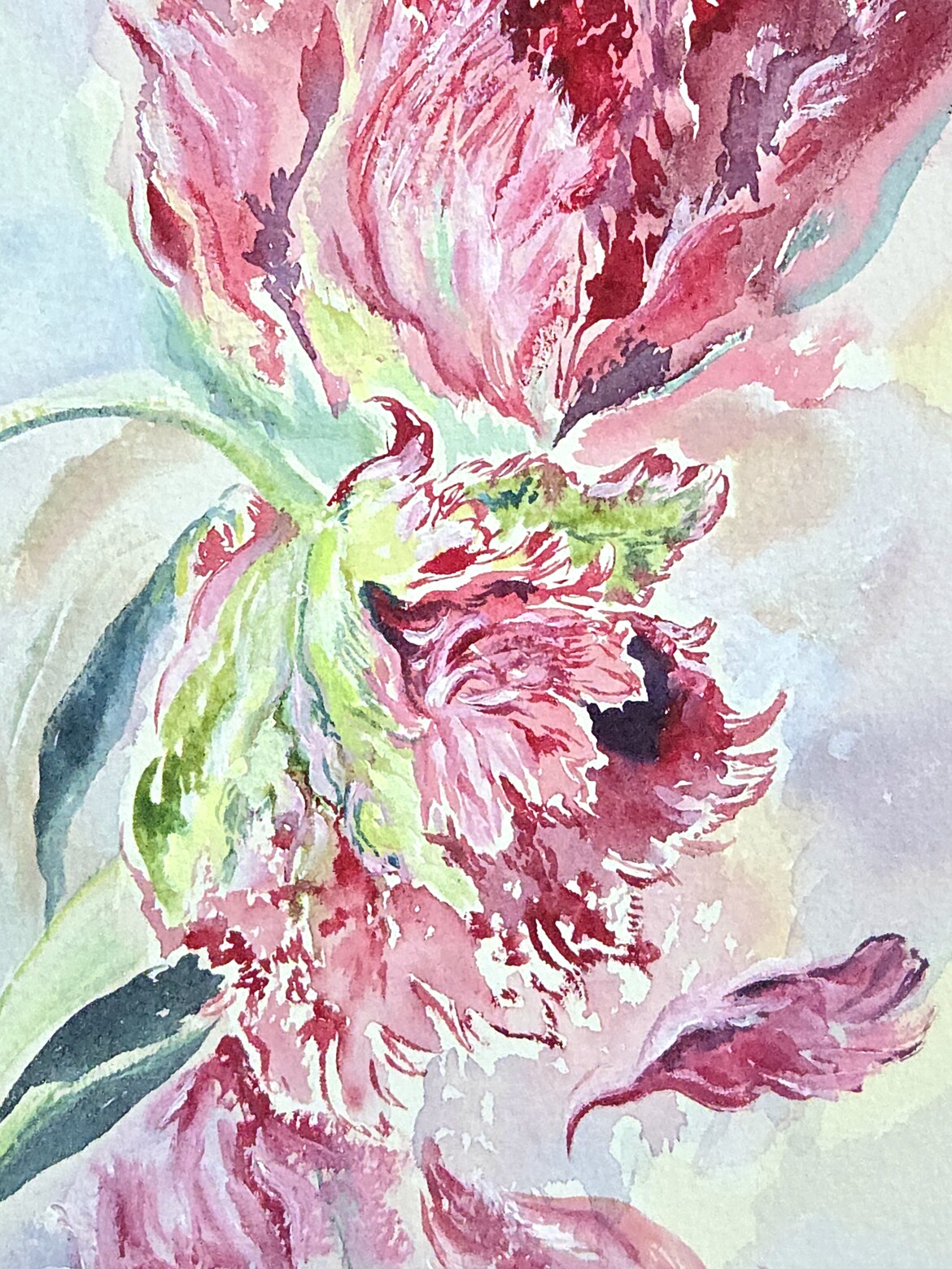 Layers of red and deep pink flow freely into one another, allowing water and pigment to create organic textures and movement. The airy background gives the flowers space to breathe, enhancing their fragile yet vibrant presence. For me, these tulips reflect transience — a celebration of beauty in its most luminous and fleeting state.