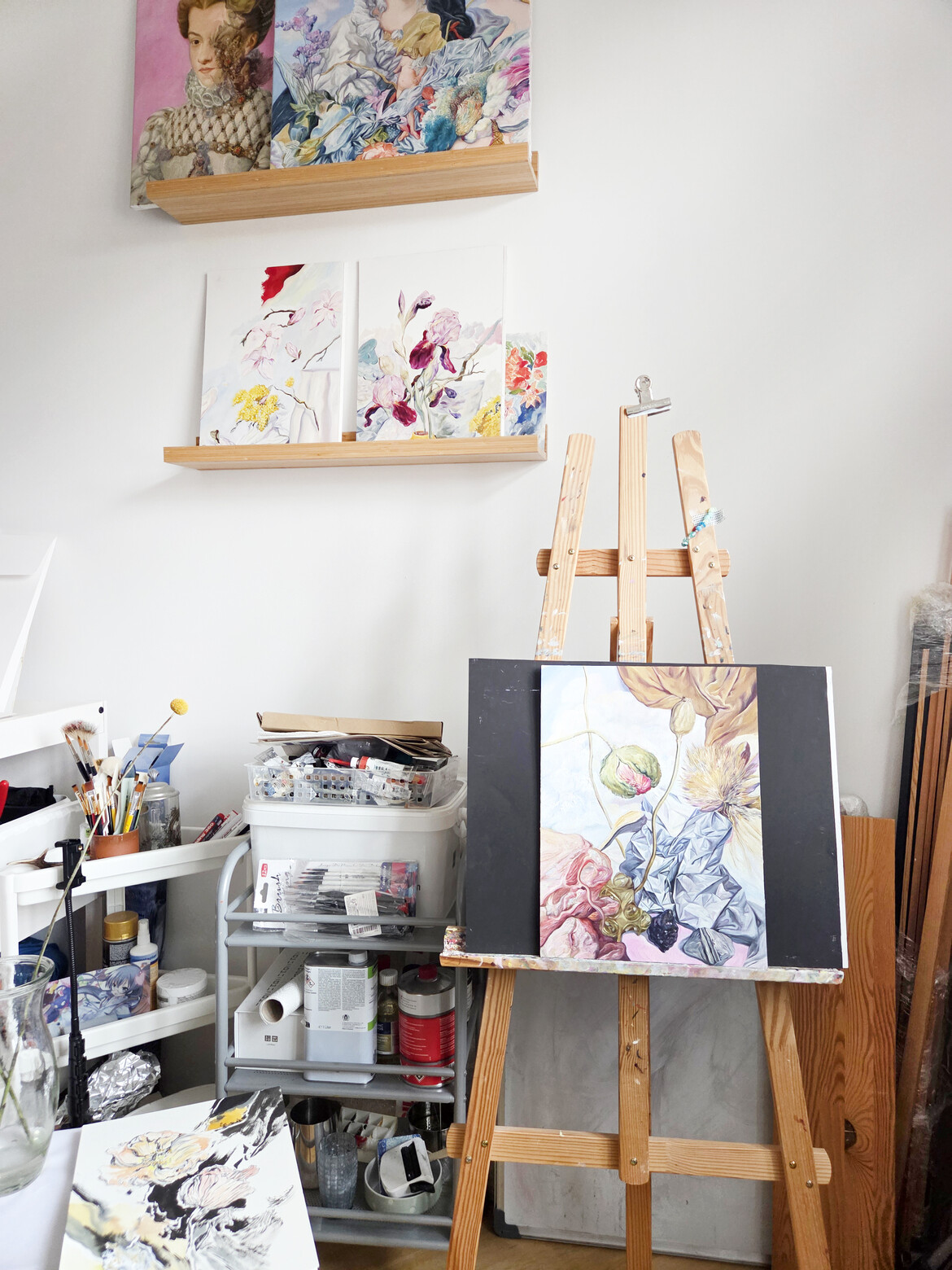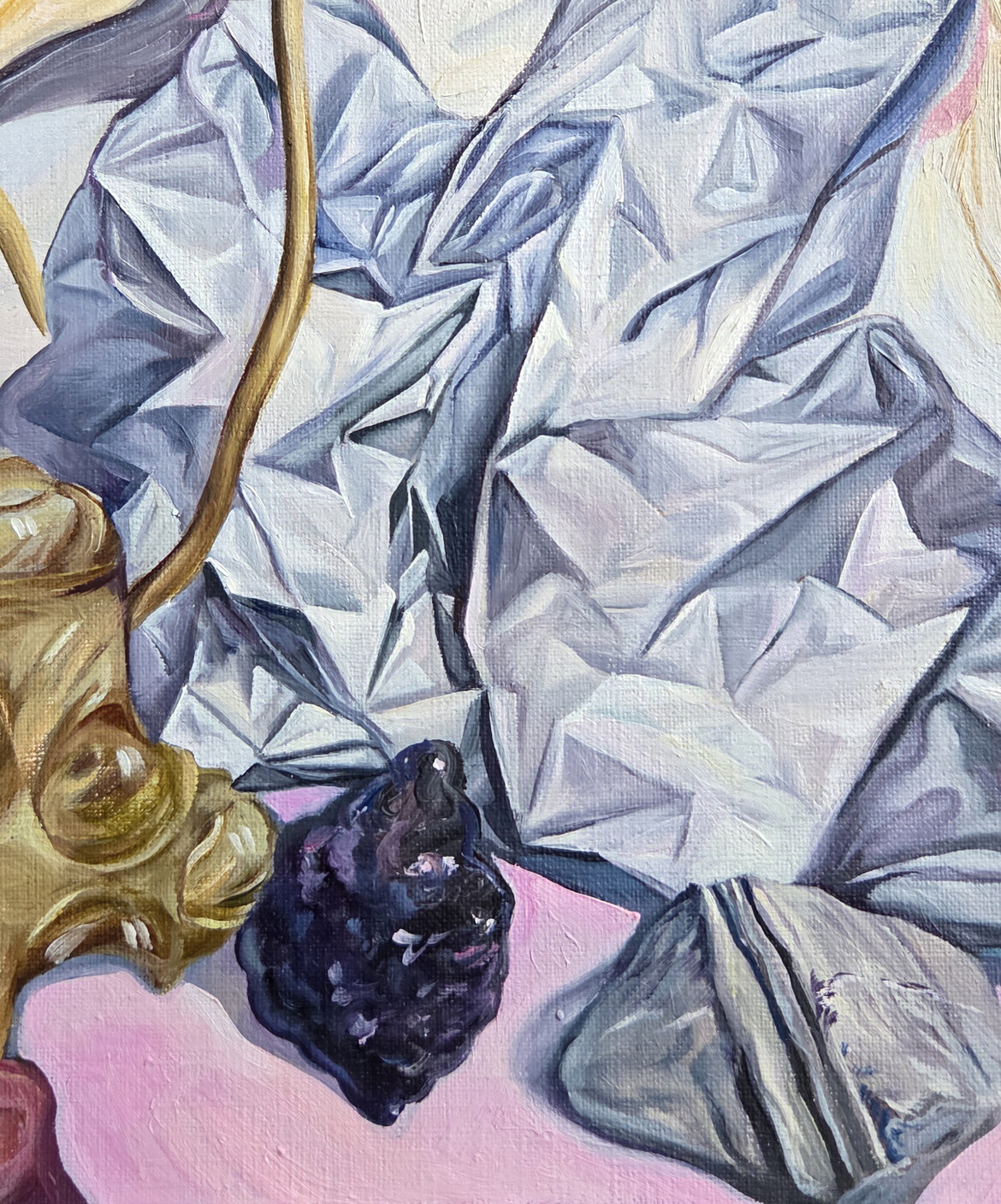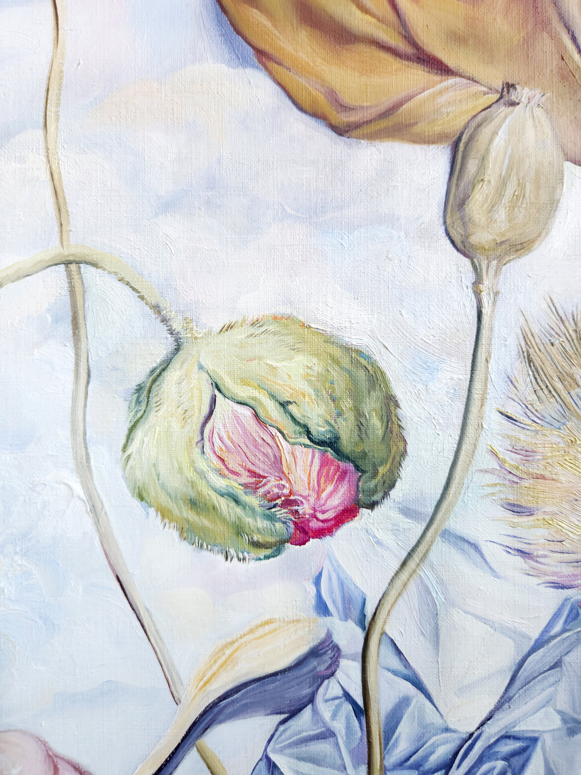 This oil painting presents a still life composed of poppies, an artichoke flower and crumpled foil. The composition juxtaposes delicate botanical forms with the solidity of stone and the visceral presence of flesh, creating a complex dialogue between organic, mineral, and bodily matter. The reflective surface of the foil introduces a contrasting artificial element that captures and refracts light, echoing the surrounding colors and forms.