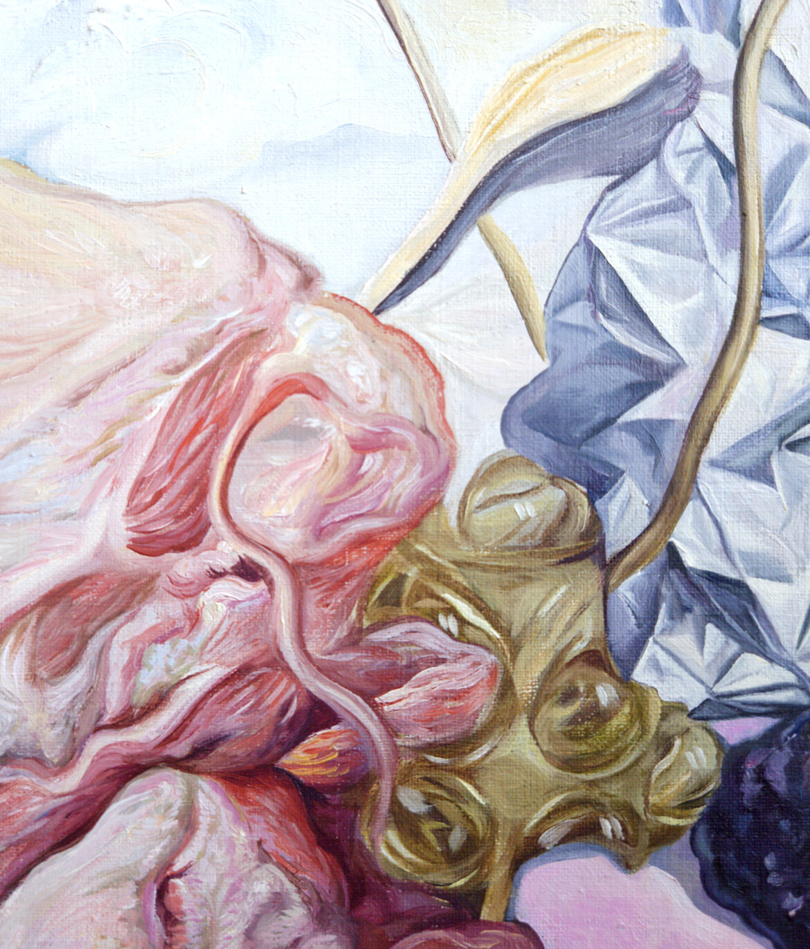 Executed in dense, layered oil paint on paper, the work emphasizes texture and material presence. Thick brushwork highlights the softness of petals, the roughness of stone, and the tactile, almost sculptural quality of flesh. Through the interaction of these contrasting elements, the painting explores themes of materiality, transformation, and the fragile boundary between natural growth, physical substance, and inert matter.